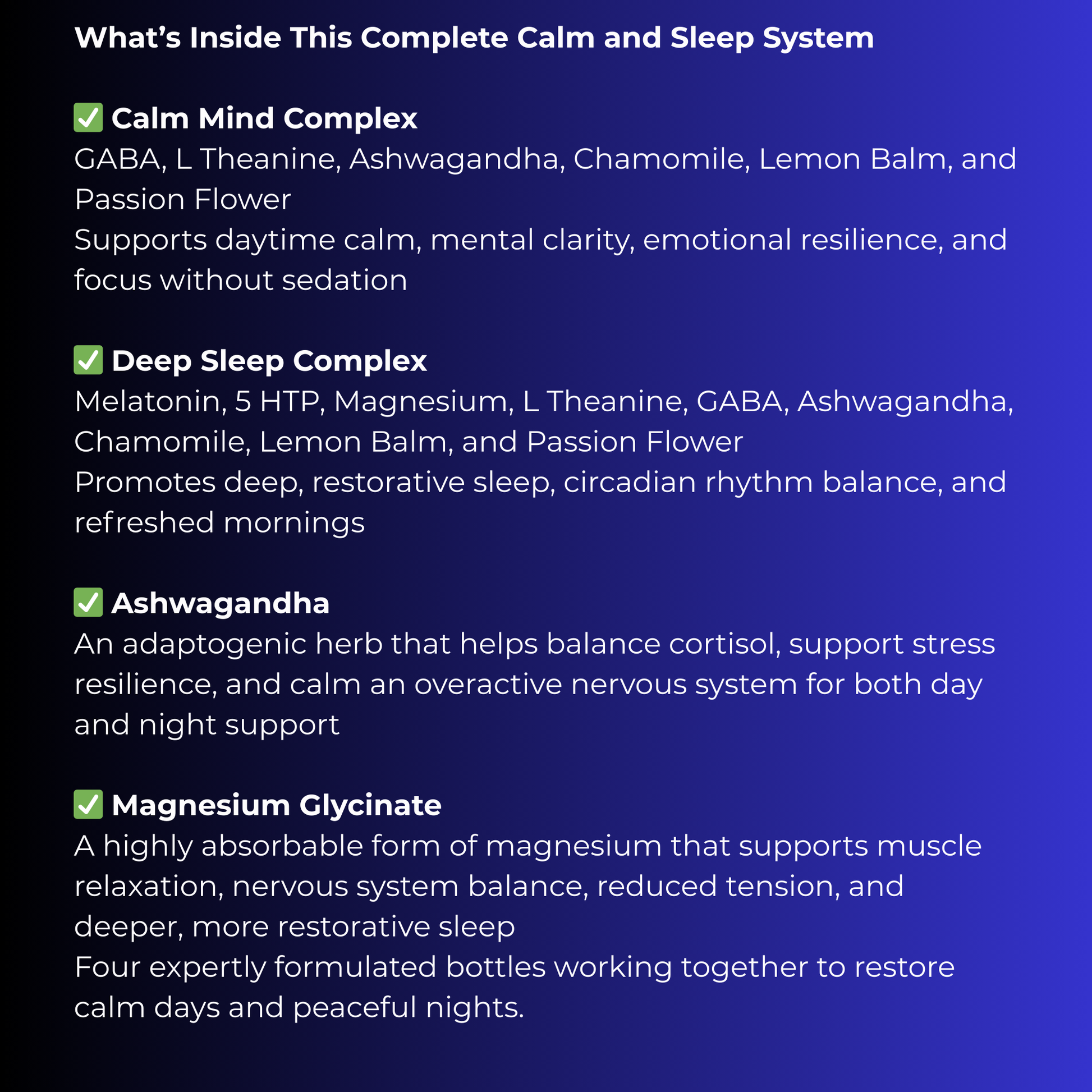 The Calm Mind Complex and Ashwagandha help quiet racing thoughts, balance cortisol, and reduce daily stress, giving your body the chance to truly relax.